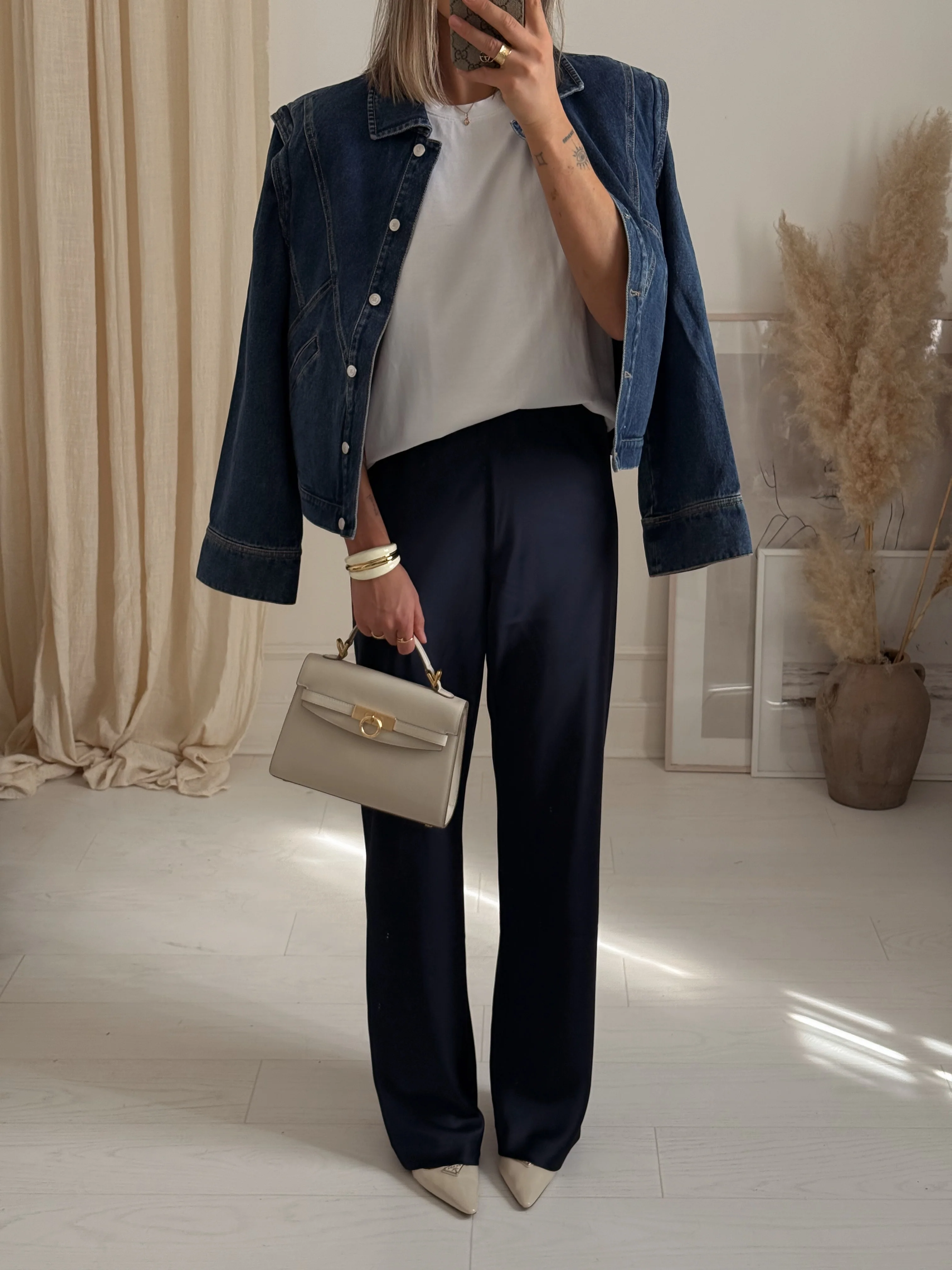 The Sandra is the ultimate capsule piece pair it with the navy Becky Silk Cami and Jenny wrap blouse for an elegant, occasion ready look, or style with our Lily Cashmere Jumper for a refined high-low mix of textures.